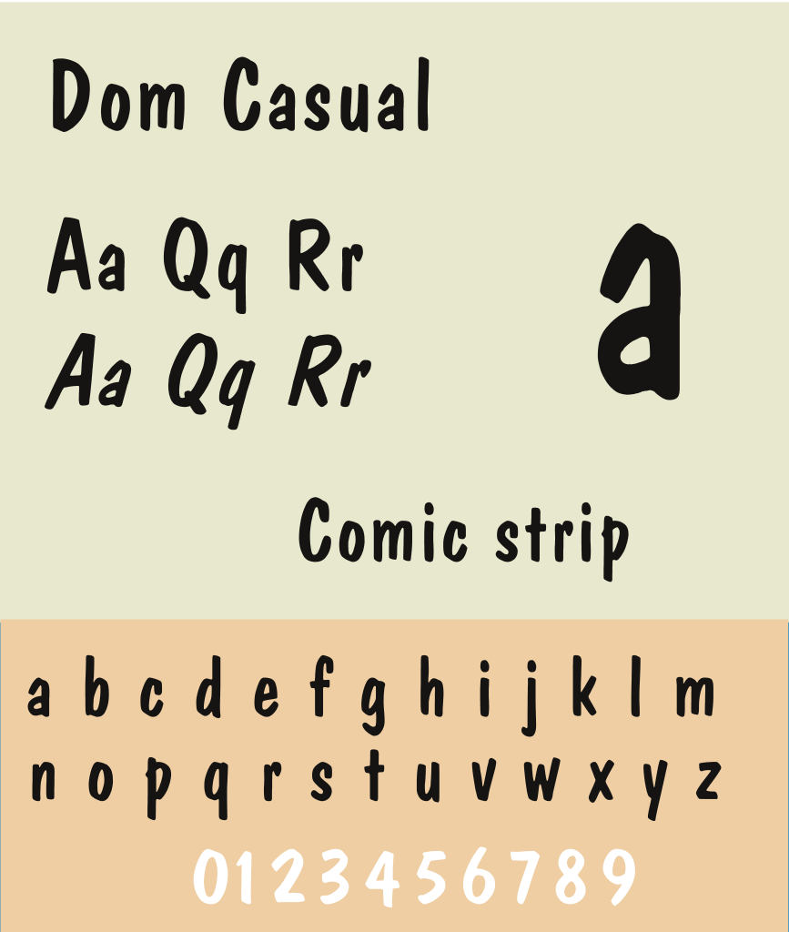 Dom Casual existe en deux graisses : regular et bold. Cette police imite le tracé manuel des caractères.
